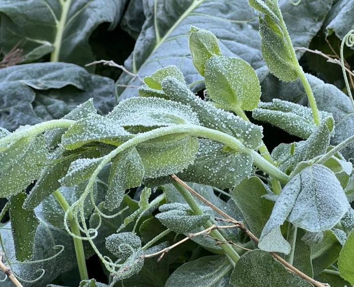 ▲刘璇外婆种的豌豆尖,叶片上覆着一层霜