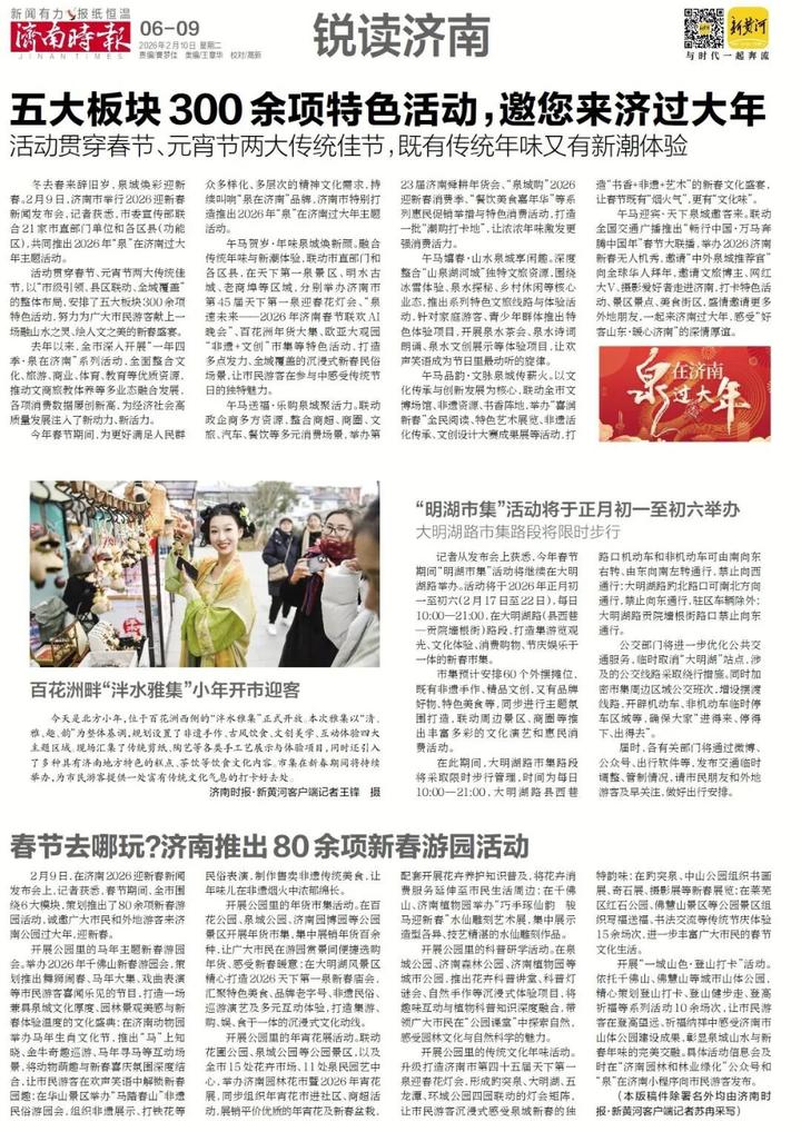 2月9日,新黄河记者从2026济南市迎新春新闻发布会上获悉,今年春节期间将继续在大明湖路举办“明湖市集”活动。活动将于2026年正月初一至初六(2月17日至22日),每日10:00—21:00,在大明湖路(县西巷—贡院墙根街)路段,打造集游览观光、文化体验、消费购物、节庆娱乐于一体的新春市集。