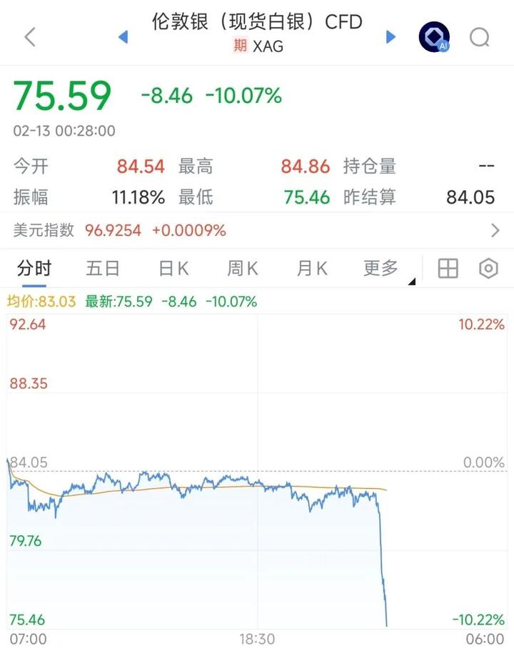 +订阅财联社2月13日电 国际贵金属直线跳水,现货黄金跌超3%,报4923美元/盎司。现货白银跌超10%,报75.59美元/盎司。
