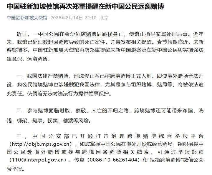 2月14日,中国驻新加坡大使馆消息:近日,一中国公民在金沙酒店赌博后跳楼身亡,使馆正指导家属处理后事。近年来,我馆已处理数起因赌博导致的死亡案件,并曾发布相关提醒。春节假期临近,来新游客增多,中国驻新加坡大使馆再次郑重提醒来新中国游客及在新中国公民切实增强法律意识,远离赌博。