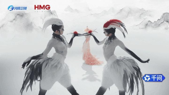 牡丹,是极富中原地域特色的文化图腾,当杨丽萍思考找寻“花”与“鹤”的舞蹈灵感时,通过一张花朵照片,千问准确识别出了洛阳红这个牡丹品种,并给出了对于“花”“鹤”这一文化意向的解读——“终幕鹤影漫入云山,牡丹傲然盛放,你守你的孤高绝尘,我赴我的浩荡乾坤”,鹤不为牡丹而栖,牡丹不因鹤而开,两者在自然中相遇,却各自守持本心。在最终呈现的表演中,佟丽娅以翩然之姿,让东方文化的大气与高洁,在时光中苏醒流传。