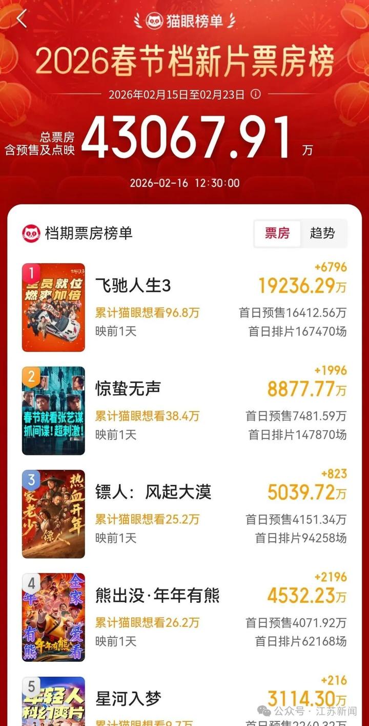 农历新年脚步临近,中国电影市场迎来年度最重要档期。据猫眼专业版数据显示,截至2月16日12:30,2026年春节档(2月15日至2月23日)新片预售总票房超4.3亿元。