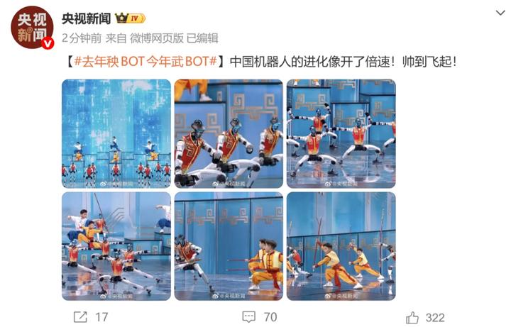 宇树科技机器人亮相央视春晚,表演武术节目。中国机器人的进化像开了倍速,从去年的扭秧歌到今年的武术,帅到飞起!
