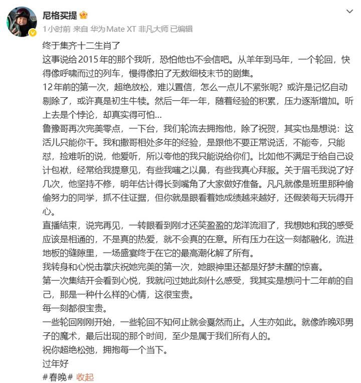 2月17日,2026年央视春晚第二天,尼格买提在个人微博发长文回顾自己主持春晚十二年的历程,内容如下: