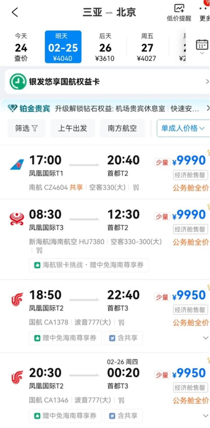 春节期间,“三亚飞北京上海机票逼近万元”等话题登上热搜。记者查询发现,2月25日,从三亚飞往北京、杭州、深圳等公务舱机票价格依旧高企,而海口前往上海、深圳还有少量经济舱机票。中国国航、中国东航、南方航空和海南航空等四大航空公司全部增加海南航班。