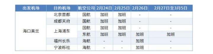 记者从海口美兰机场最新获悉,海口美兰机场联合中国国航、中国东航、海南航空再次加班。其中,中国国航增加2月24日至25日海口美兰至北京首都、海口美兰至成都天府、海口美兰至上海浦东,每日各一班;中国东航增加2月24日至3月5日海口美兰至上海浦东航班,每日一班;海南航空增加2月26日海口美兰至福州长乐、宁波栎社航班,各一班次。