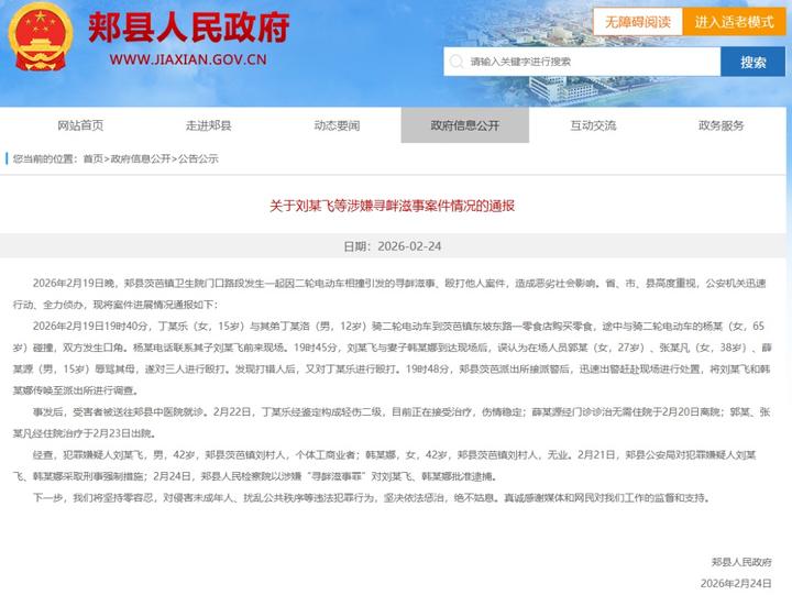 2026年2月19日晚,郏县茨芭镇卫生院门口路段发生一起因二轮电动车相撞引发的寻衅滋事、殴打他人案件,造成恶劣社会影响。省、市、县高度重视,公安机关迅速行动、全力侦办,现将案件进展情况通报如下: