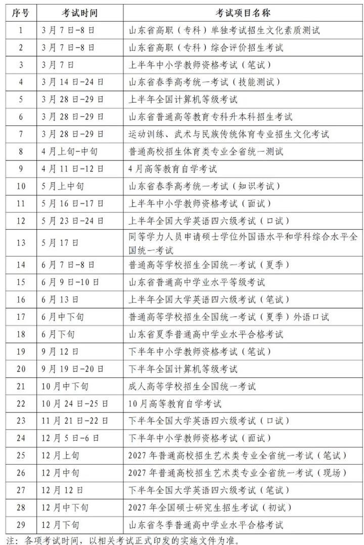 今天,山东省教育招生考试院公布了2026年山东省教育考试时间安排表,请相关考生注意: