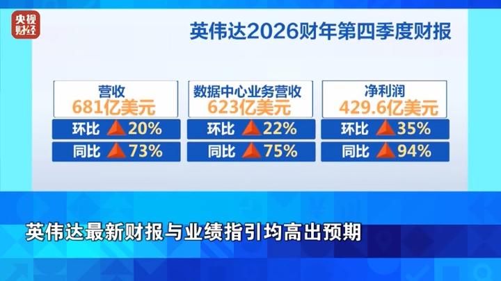 公司方面,英伟达周三盘后发布的财报显示,在截至今年1月25日的2026财年第四季度,英伟达营收为681亿美元,同比增长73%,创公司单季度营收历史新高。同时,公司当季的每股收益显著高出华尔街预期,净利润同比几乎翻倍。公司超过九成的销售额来自其最核心的数据中心业务,也就是AI算力芯片销售。
