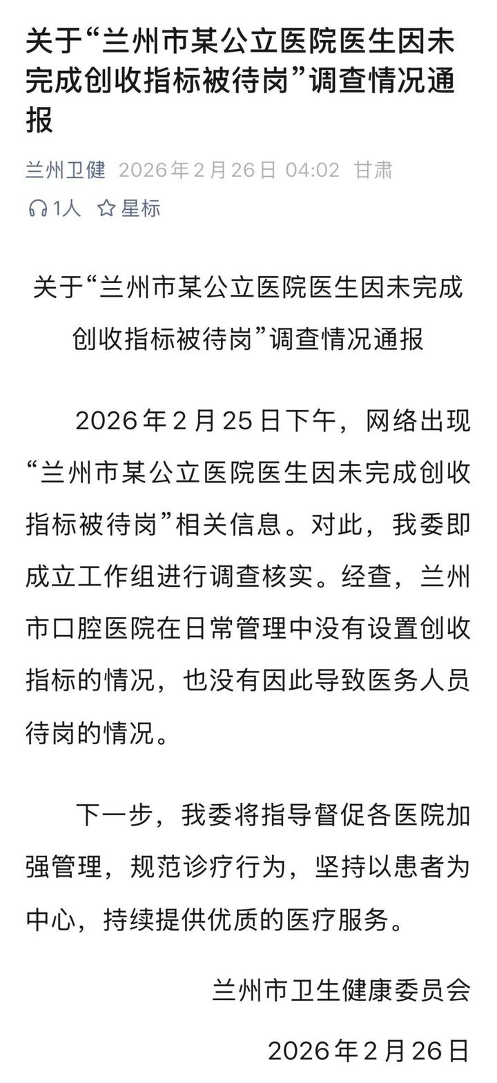 2026年2月25日下午,网络出现“兰州市某公立医院医生因未完成创收指标被待岗”相关信息。对此,该委即成立工作组进行调查核实。经查,兰州市口腔医院在日常管理中没有设置创收指标的情况,也没有因此导致医务人员待岗的情况。