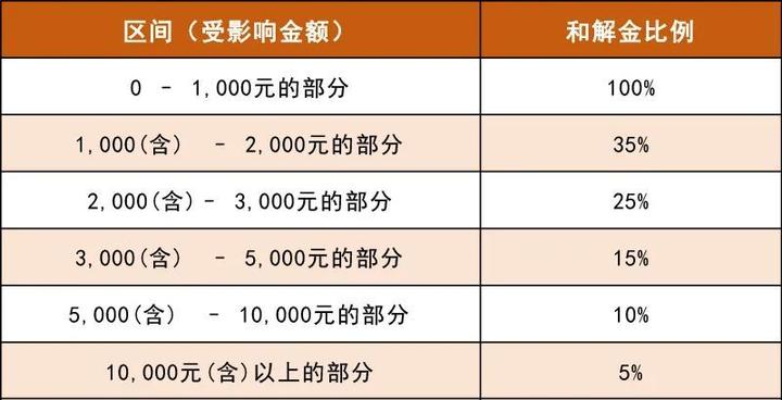 3.1000元以上部分的比例以超额累退原则乘以相应比例确定总和解金额。具体比例如下表,案例如文末说明: