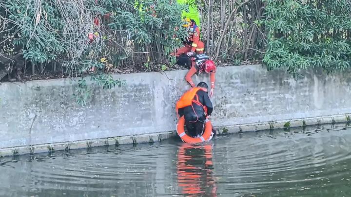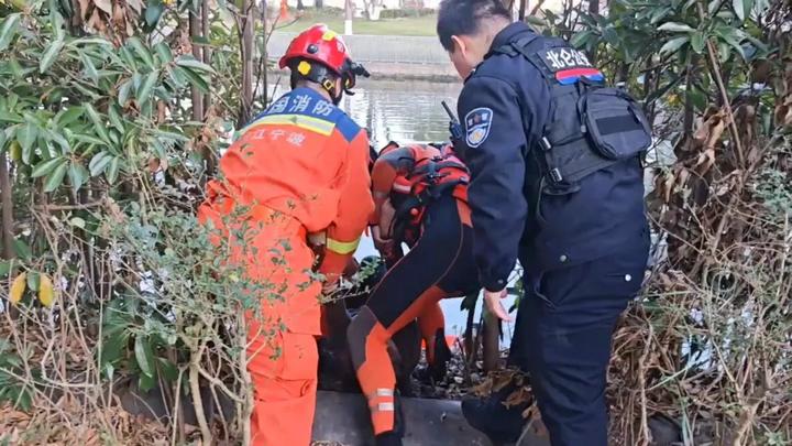 10多分钟后,救援力量陆续到场。当时,落水老人因长时间浸泡和体力透支,仅有微弱的动弹,情况危急。民警立即设置警戒区域,疏散围观群众。消防员穿戴好水域救援装备,携带救生圈、救援绳等器材,小心翼翼地蹚入冰冷的水中,向落水老人靠近。