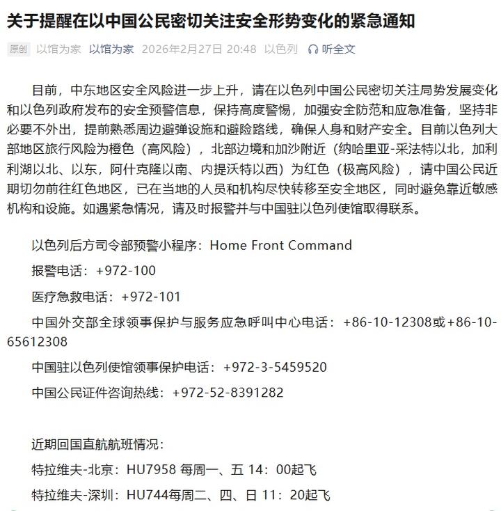 中国驻以色列使馆发布《关于提醒在以中国公民密切关注安全形势变化的紧急通知》: