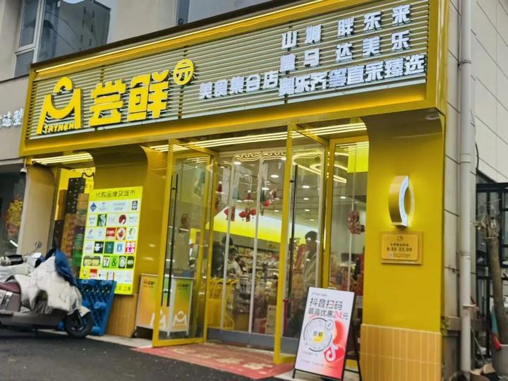 店门头不大,名字叫“尝鲜”。内里货架摆得满满当当:山姆的零食和烘焙、胖东来的熟食和日用品、奥乐齐自营日化商品,还有达美乐的披萨。