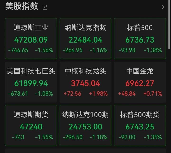 受非农数据爆冷影响,美股三大指数集体低开。截至发稿,道指跌1.56%,纳指跌1.16%,标普500指数跌1.38%。纳斯达克中国金龙指数涨0.71%,其中,京东涨超5%。