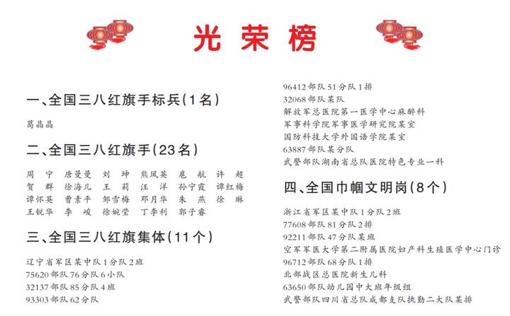 全国三八红旗手标兵、全国三八红旗手、全国三八红旗集体、全国巾帼文明岗,是全国妇联授予我国优秀女性(优秀女性群体)的最高荣誉。解放军和武警部队受表彰的个人和集体,是军队各条战线、各自领域、各个岗位涌现出的先进典型。她们自觉加强政治锻造,练兵备战心无旁骛、科研攻关勇攀高峰、守边固防担当奉献,在打好实现建军一百年奋斗目标攻坚战中贡献巾帼智慧、巾帼力量,充分彰显了新时代军队女性铁心向党、矢志强军的政治底色,精武强能、建功军营的事业追求,立足岗位、创先争优的昂扬风貌。