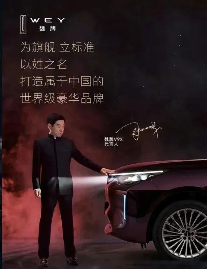争议源于魏牌V9X发布的一张预热宣传海报。画面中,魏建军身着黑色中山装,单手轻触车头,站立在红黑渐变的光影背景中,海报配有“以姓之名,打造属于中国的世界级豪华品牌”的宣传语。整体画面采用低机位拍摄,并以强光源突出人物与车辆主体。