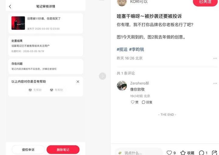 值得注意的是,3月5日傍晚,“KORI可以”发布的维权内容一度因被投诉“涉嫌发布不实信息”和“名誉侵权”而被平台下架。随着该情况被公开,争议的焦点也从设计本身,进一步延伸至品牌的危机应对方式。