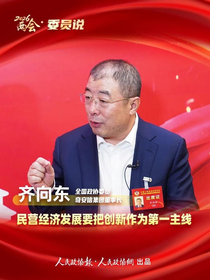 “‘十五五’时期,民营经济要坚定不移将创新作为发展第一主线,以科技创新引领产业升级。”近日,全国政协委员、全国工商联副主席、奇安信集团董事长齐向东在接受记者采访时表示。