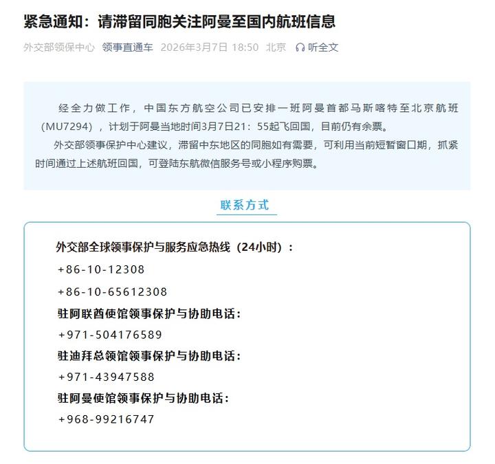 经全力做工作,中国东方航空公司已安排一班阿曼首都马斯喀特至北京航班(MU7294),计划于阿曼当地时间3月7日21:55起飞回国,目前仍有余票。