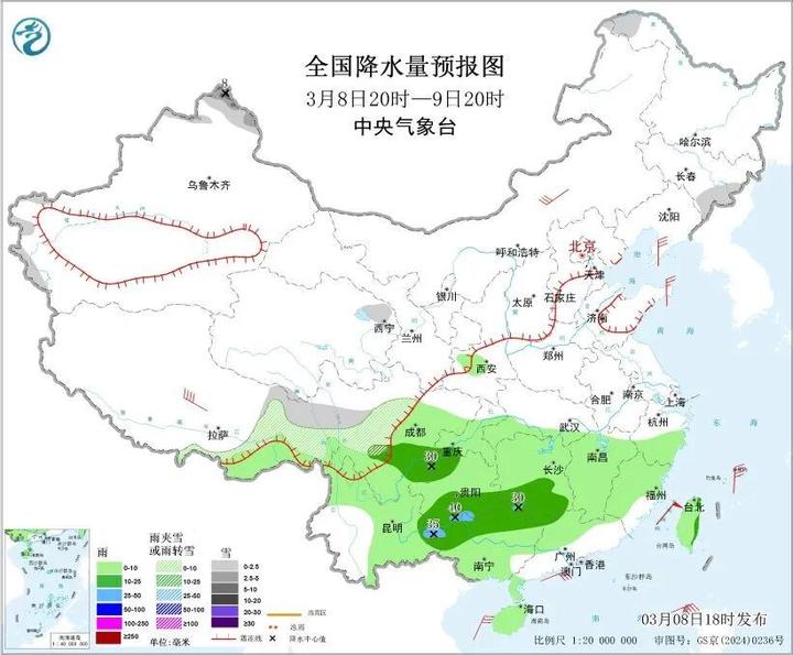 3月8日20时至9日20时,西藏东南部、川西高原北部、青海东北部、黑龙江西北部、吉林东部等地部分地区有小雪或雨夹雪,其中,新疆北疆北部等地部分地区有中到大雪;江南大部、华南西部和北部、海南岛、台湾岛等地部分地区有小到中雨,其中,四川南部、贵州南部、广西北部等地部分地区有大雨。