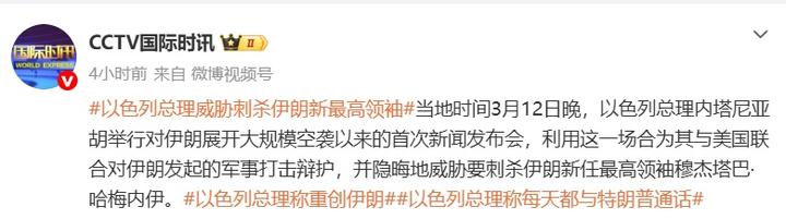 据CCTV国际时讯,当地时间3月12日晚,以色列总理内塔尼亚胡举行对伊朗展开大规模空袭以来的首次新闻发布会,利用这一场合为其与美国联合对伊朗发起的军事打击辩护,并隐晦地威胁要刺杀伊朗新任最高领袖穆杰塔巴·哈梅内伊。