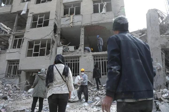 3月12日,在伊朗首都德黑兰,市民从损毁的建筑里搜寻生活用品。新华社记者 沙达提 摄