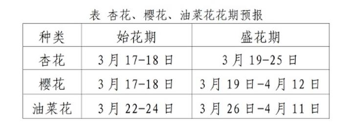 今年2月以来全区平均气温较常年偏高,降水偏多,对花芽萌发有利。根据最新气象资料分析,受冷空气影响预计3月14日—15日阴有小雨,气温略低,16日以后气温回升较快,有利于杏花、樱花、油菜花开放。预计章丘区2026年杏花、樱花、油菜花始花期较去年偏早,具体预报如下表: