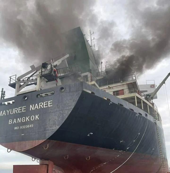 这张泰国海军3月11日发布的照片显示,一艘泰国货船在霍尔木兹海峡海域遭袭起火。 新华社发(泰国海军供图)