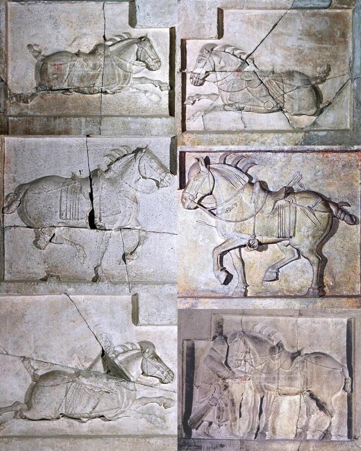 西安碑林博物馆的“昭陵六骏”,采用高浮雕手法,以简洁的线条,准确的造型,生动传神地刻画了曾为唐太宗李世民冲锋陷阵的六匹战马,表现出它们的体态、性格和战阵中身冒箭矢、驰骋疆场的情景。