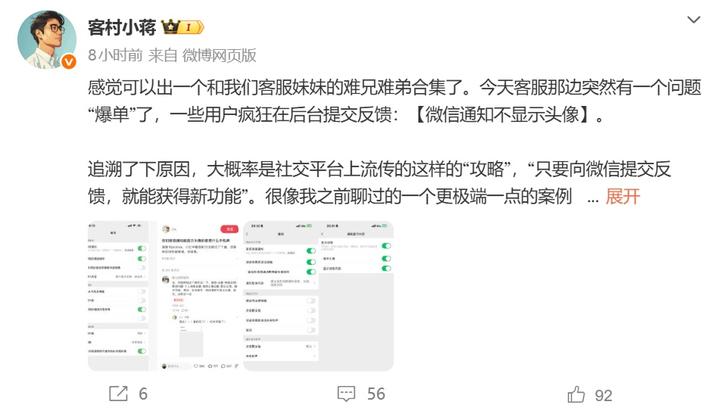 针对近期大量用户集中反馈“通知不显示头像”的问题,客村小蒋解释称,这可能与社交平台上流传的所谓“提交反馈即可开通新功能”的攻略有关,导致部分用户误以为通过反馈可以提前获取该功能,实际上,这只是时间上的巧合。