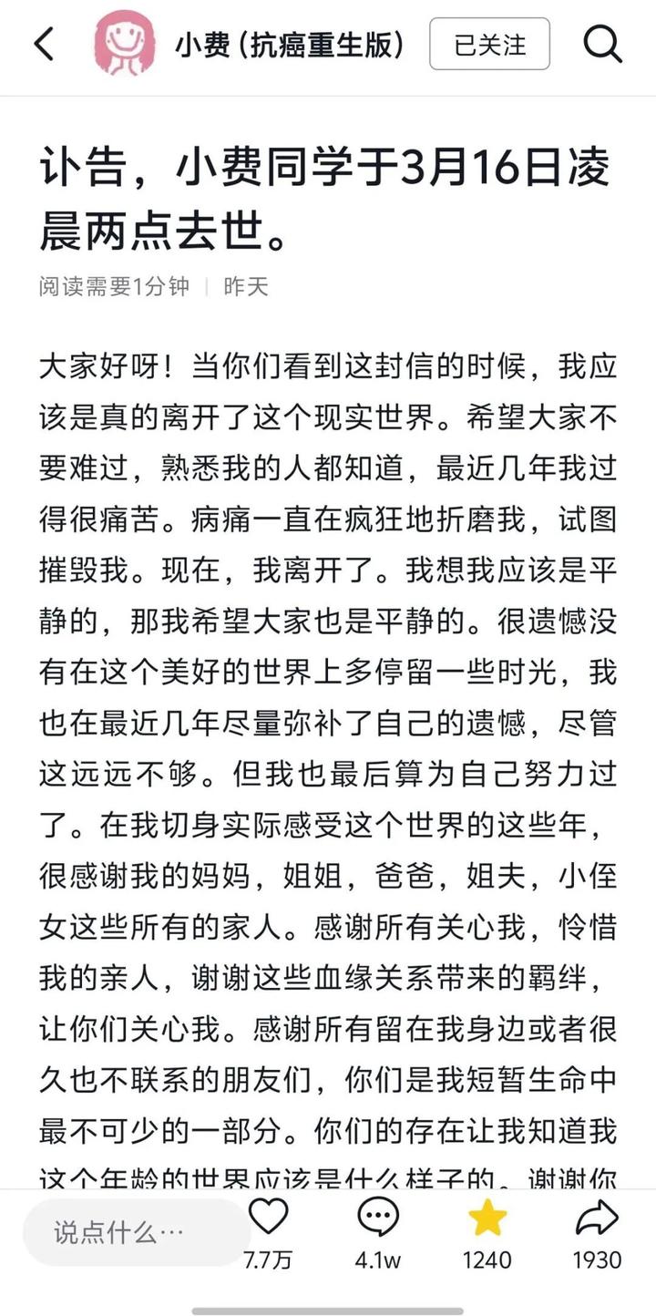 “家人、亲人、朋友、病友、长辈、一面之缘的朋友、医护工作者,我很感激与你们每一个人的相识和交流。你们让我的生命丰富多彩,我希望你们的生命也同样丰富多彩,平安幸福。”