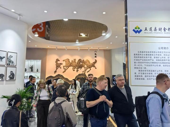 展会首日,五莲两大专属展台C馆C3023、C3L42 同步登场,一开馆便成为全场焦点。其中C3023展台由五莲石材产业园、五莲县财金投资集团联合打造,全面呈现五莲石材产业集群优势与全产业链实力;C3L42宏磊石材专属展区,集中展示企业特色产品与核心工艺。五莲县财金投资集团带来的海贝花矿体尤为亮眼,该矿体源自4.39亿年前的古生物化石,属国家A类石材,凭借独特优势成为引爆本次展会的亮点,吸引海内外客商纷纷驻足咨询、洽谈合作。