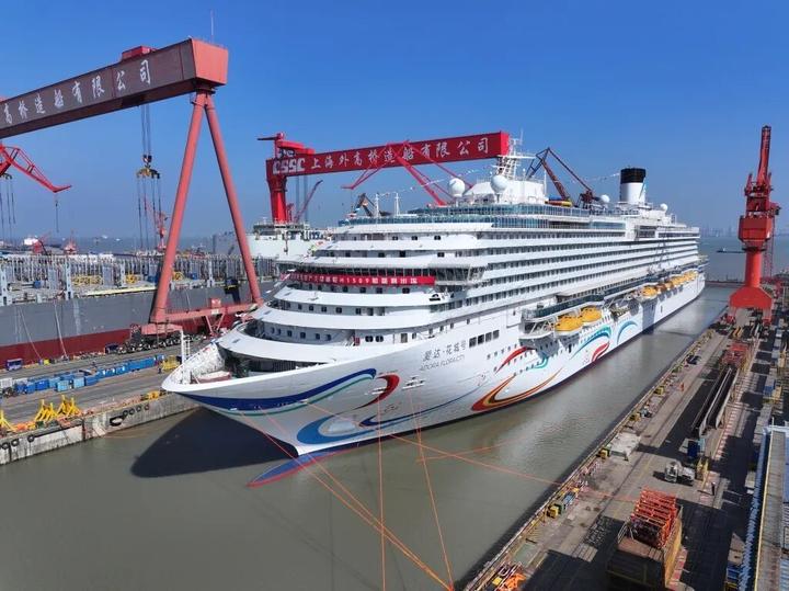 3月20日,中国旅游集团华夏邮轮所属爱达邮轮旗下第二艘国产大型邮轮爱达·花城号(Adora Flora City)在中国船舶集团上海外高桥造船有限公司出坞。
