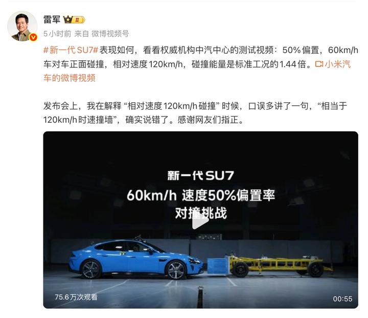 此前3月19日晚,雷军在介绍新一代SU7时称“两辆车都是60km/h,相对时速是120km/h,就相当于你开120km/h撞到墙上,这个碰撞能量是标准测试工况的1.44倍”,引发网友热议。