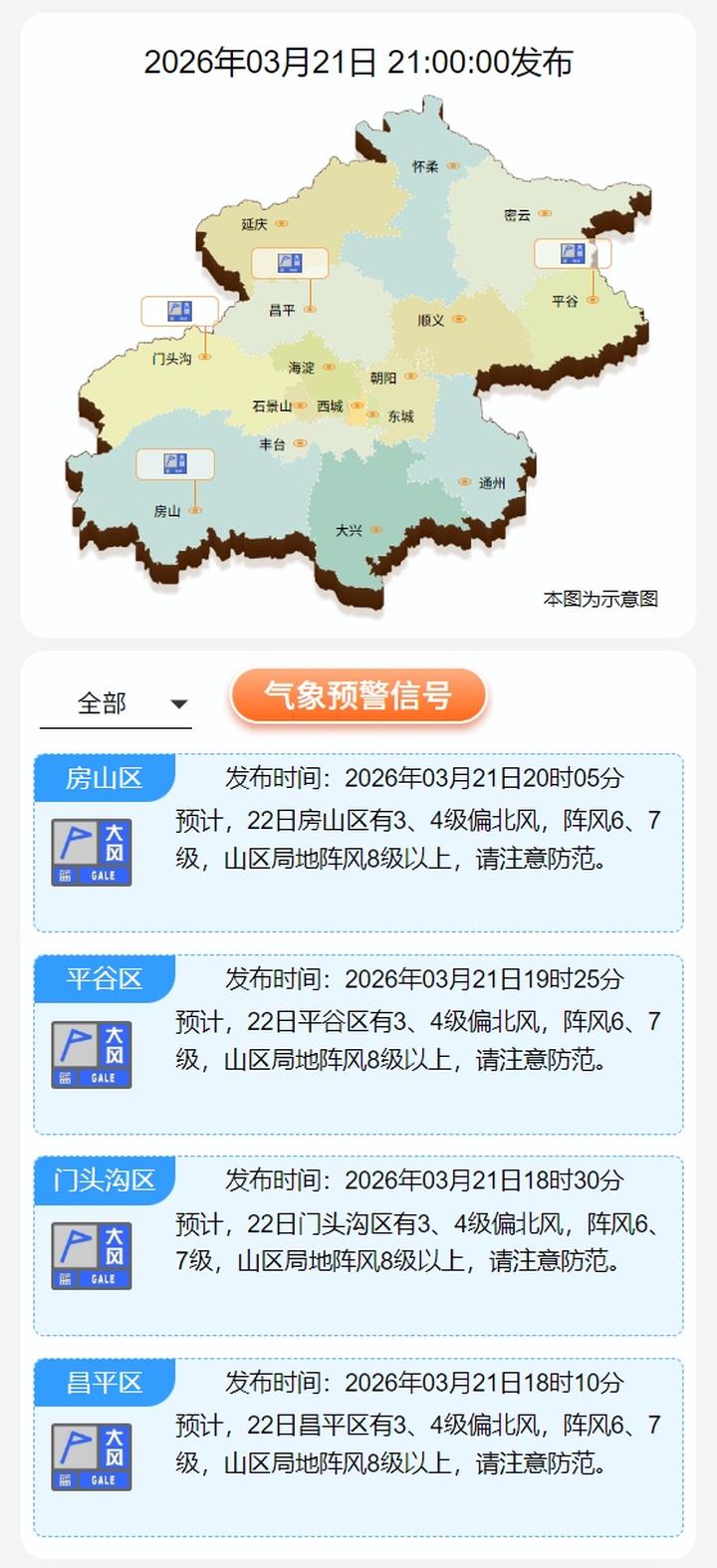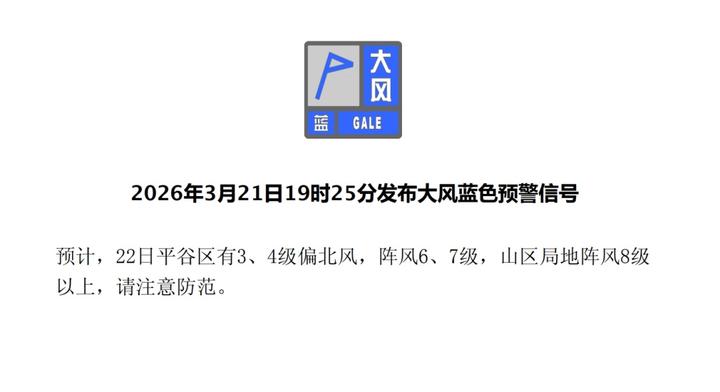 平谷区发布大风蓝色预警:预计,22日平谷区有3、4级偏北风,阵风6、7级,山区局地阵风8级以上,请注意防范。