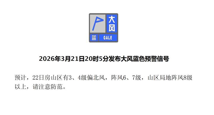 房山区发布大风蓝色预警:预计,22日房山区有3、4级偏北风,阵风6、7级,山区局地阵风8级以上,请注意防范。