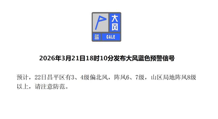 昌平区发布大风蓝色预警:预计,22日昌平区有3、4级偏北风,阵风6、7级,山区局地阵风8级以上,请注意防范。