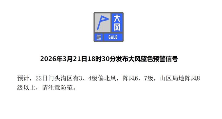 门头沟区发布大风蓝色预警:预计,22日门头沟区有3、4级偏北风,阵风6、7级,山区局地阵风8级以上,请注意防范。
