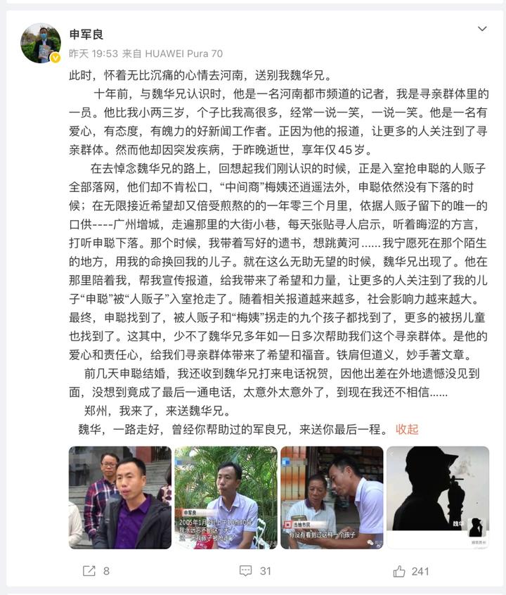 十年前,与魏华兄认识时,他是一名河南都市频道的记者,我是寻亲群体里的一员。他比我小两三岁,个子比我高很多,经常一说一笑。他是一名有爱心,有态度,有魄力的好新闻工作者。正因为他的报道,让更多的人关注到了寻亲群体。然而他却因突发疾病,于昨晚逝世,享年仅45岁。