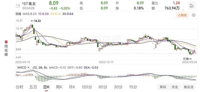 3月24日,*ST集友开盘直线跌停,股价报8.09元/股,总市值约42.43亿元。