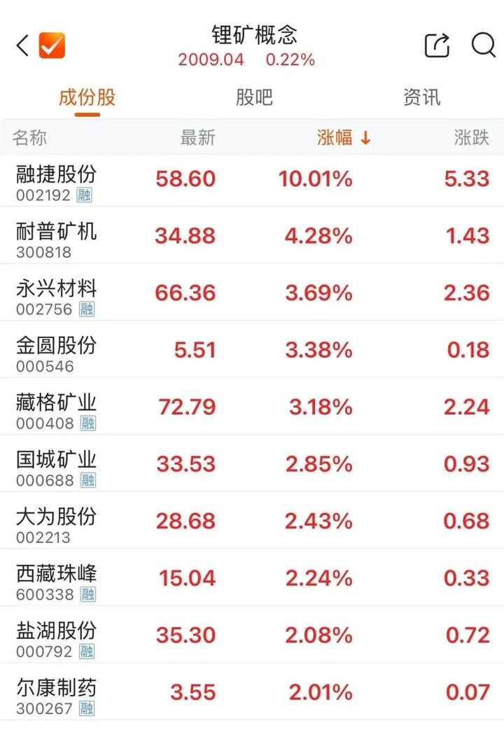 +订阅3月24日,A股主要指数集体高开,深证成指、创业板指随后回落翻绿。广期所碳酸锂主力合约早盘涨超6%,锂矿概念股上涨,融捷股份(002192)涨停,藏格矿业、国城矿业等跟涨。
