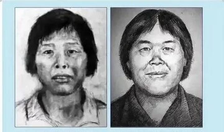 △图左(2017年,广东警方发布的第一张“梅姨”画像),图右(2019年,林宇辉画的“梅姨”新版画像)。