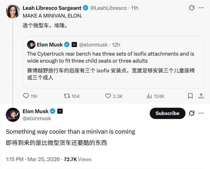 3月25日,特斯拉CEO埃隆·马斯克(Elon Musk)在X平台回应用户关于推出小型货车的建议时称:“比小型货车酷炫得多的东西即将到来。”另外,马斯克近日还确认特斯拉全新Roadster电动超跑即将正式发布。