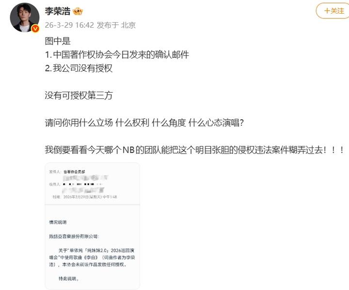 随后,李荣浩再发著作权协会情况说明,控诉单依纯:请问你用什么立场?什么权利?什么角度?什么心态演唱?