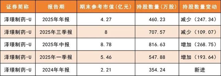 从中欧医疗健康混合基金对泽璟制药的持仓变动情况看,早在2023年底,该基金就持有泽璟制药133万股,2024年底新进为该公司前十大股东,2025年上半年持续加仓。从2025年下半年开始减持,其中三季度减持109万股,四季度再度减持247万股。