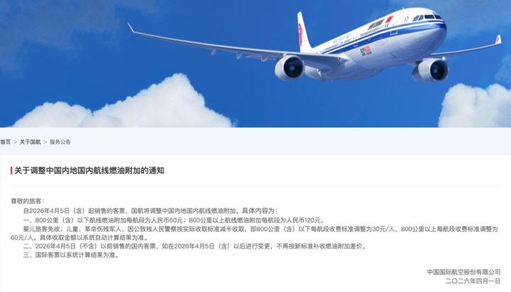 自2026年4月5日(含)起销售的客票,国内航线旅客运输燃油附加费收取标准调整为:800公里(含)以下航段,每位旅客收取人民币60元;800公里以上航段,每位旅客收取人民币120元。