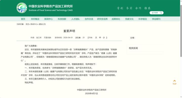 其标榜的中国农业科学院农产品加工研究所“技术支持”,已被该所澄清