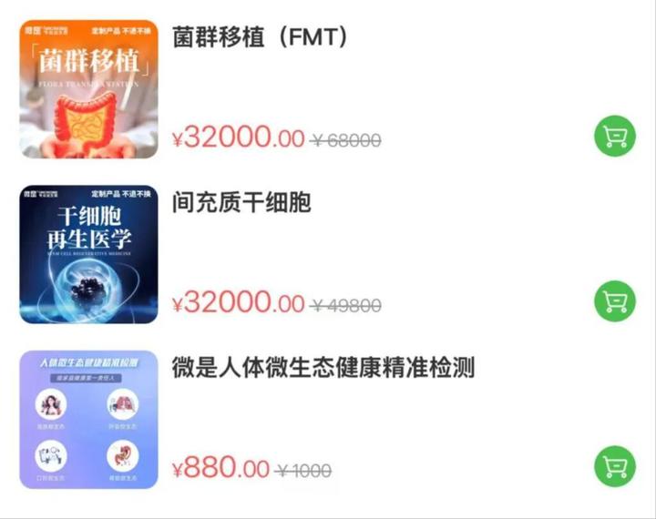 记者注意到,在该APP上售卖的不少产品疑似不符合相关规范。例如,“微生态专区”上售卖有“免疫细胞(NK)的套餐,产品称是定制产品,为“免疫细胞,再生医学”,价格为32000元;另一个名为“间充质干细胞”的产品显示,该产品为“干细胞再生医学”,价格同样为32000元。