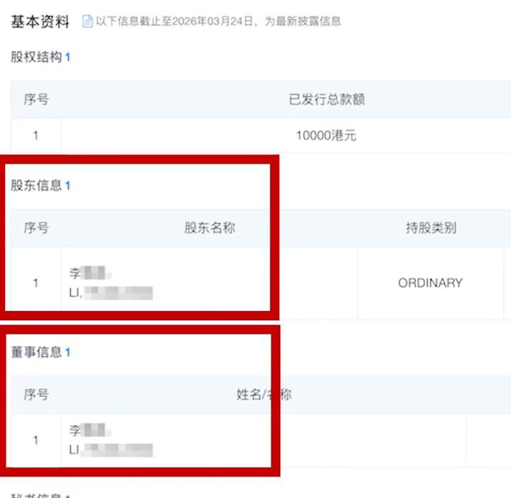 记者查询最新信息发现,“李博士”宣称的香港制药公司研发,公司股东和董事长都是“李博士”,同时他本人100%持有这个公司股份,股份总数10000HKD,换算成人民币不到9000块,公司成立的时间在去年3月25日。